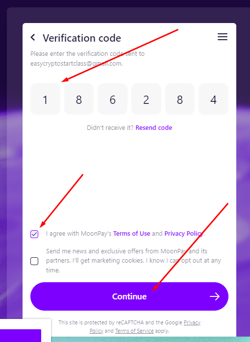 4. You'll receive a verification code on e-mail, enter it. Select "agree" checkbox and press "continue"